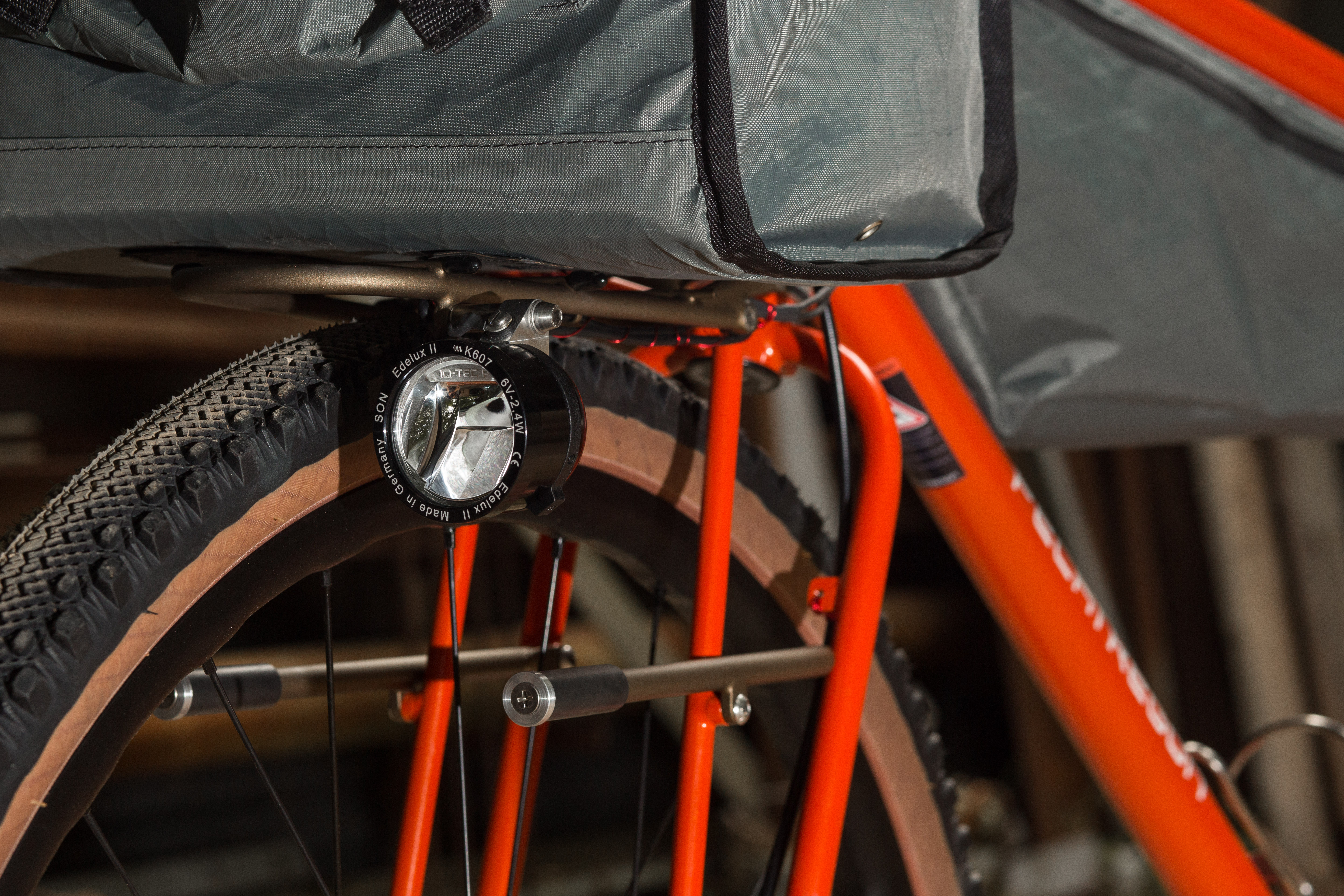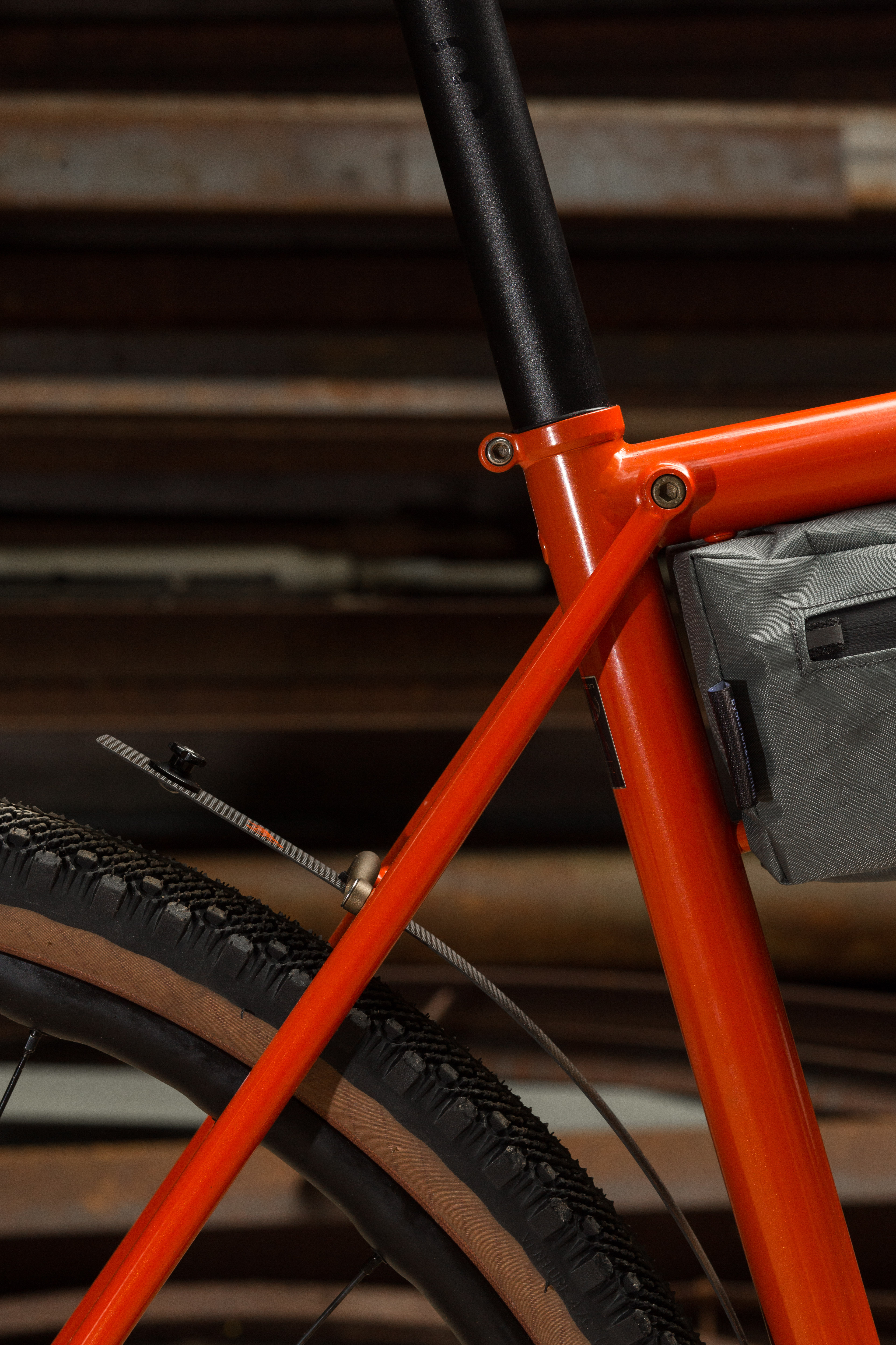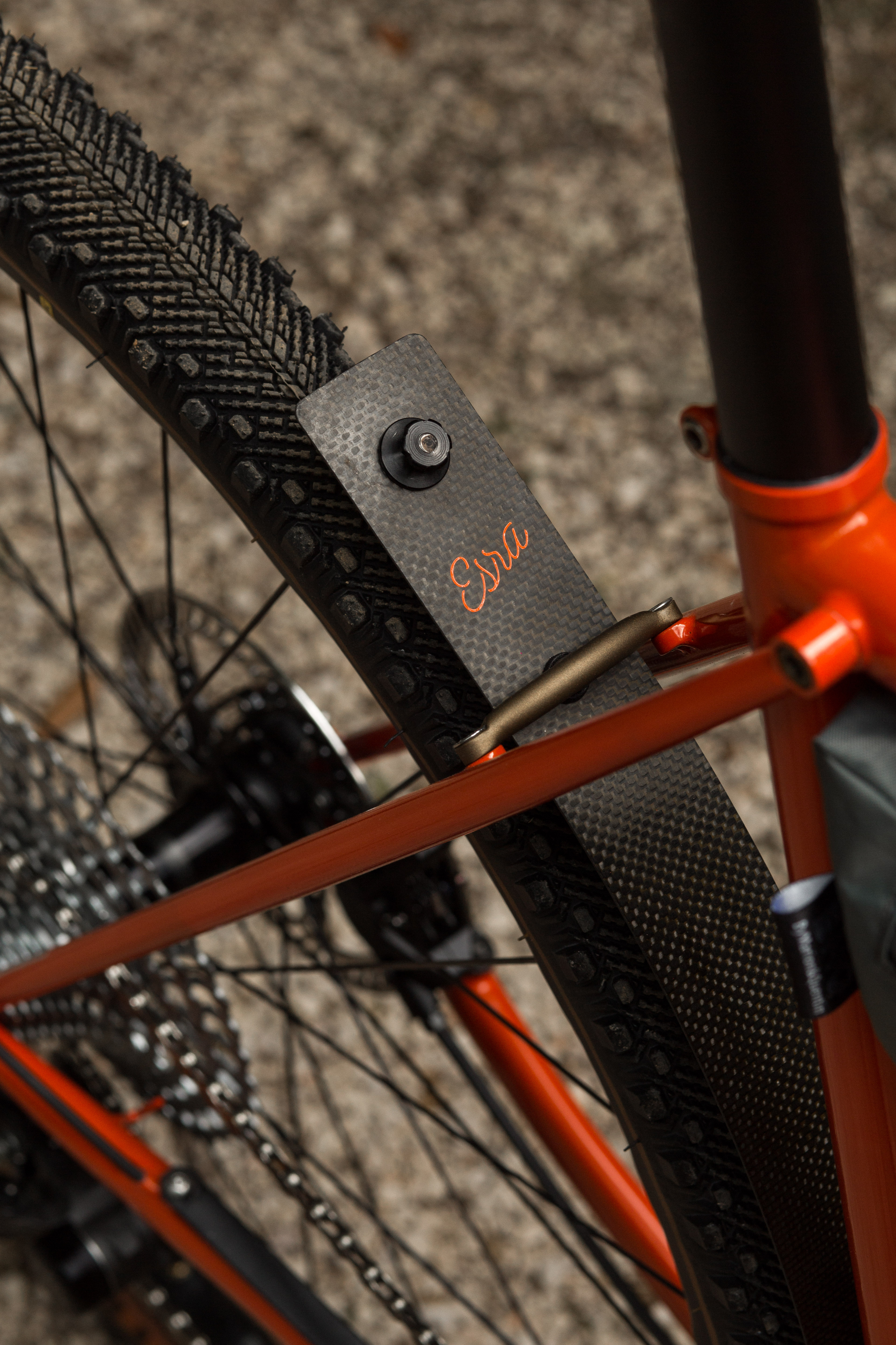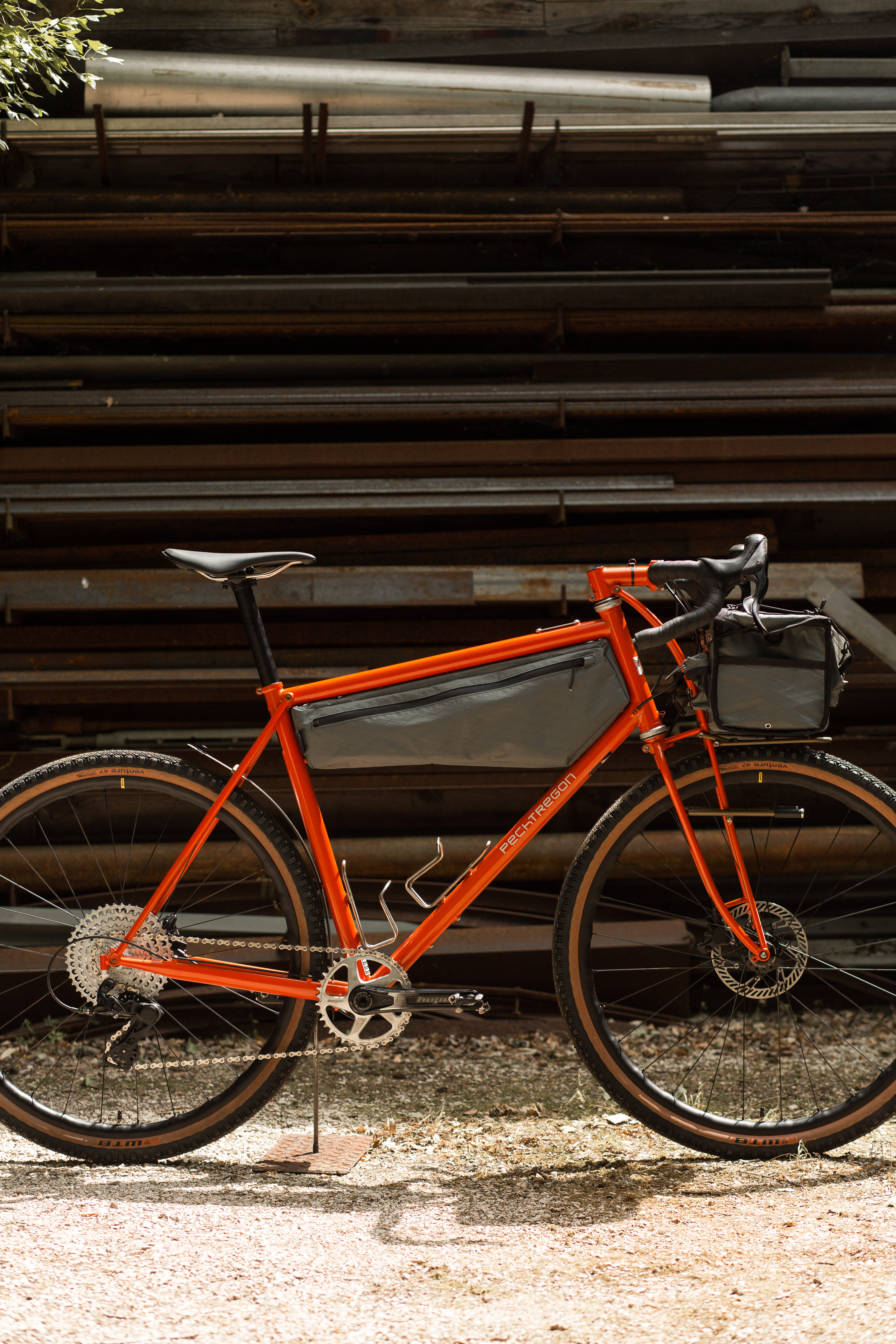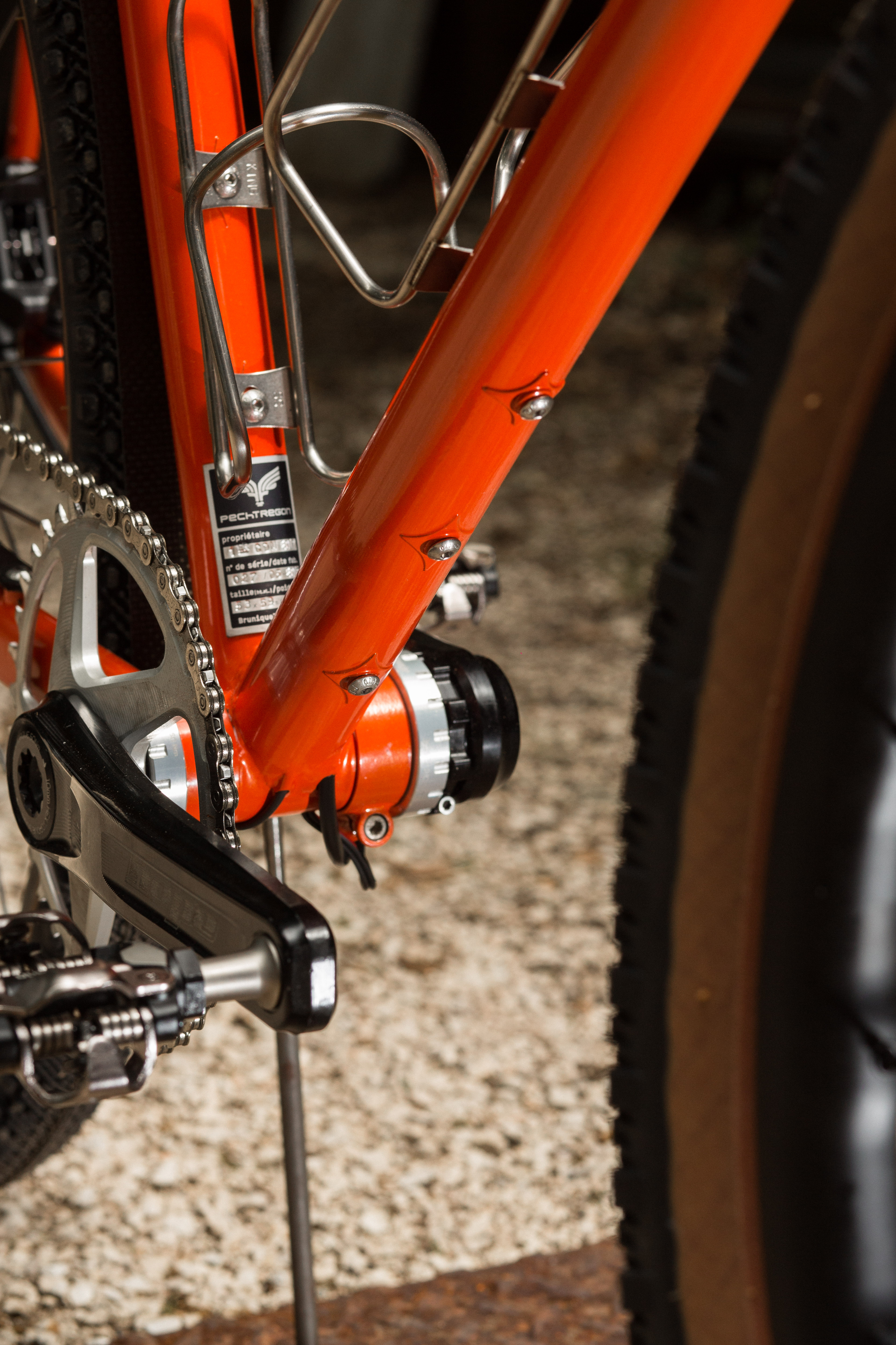 Esra V.2 répond en tout point au cahier des charges du Concours de Machines 2017 à Ambert, qu'il a d'ailleurs remporté. C'est un GravelTour vif, pliable, constamment amélioré depuis sa première mouture lors du Concours. Désormais revêtu d'une magnifique robe orangée pailletée de fines particules dorées et de composants haut de gamme, ce vélo emblématique des productions PechTregon a intégralement été remis à neuf : il est désormais mis à la vente pour continuer son parcours dans d'autres mains.